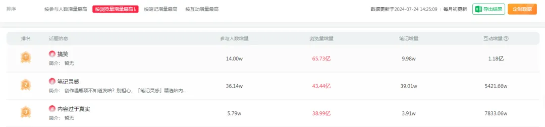 对比6月、7月的数据,可以看出小红书“搞笑”的话题浏览量有所上涨,增加了10亿的浏览量,这说明小红书“搞笑”类的笔记/视频还是呈现持续上升趋势,但笔记增量才9.98w,这说明当中还蕴含着巨大的流量。