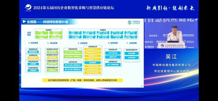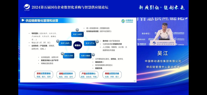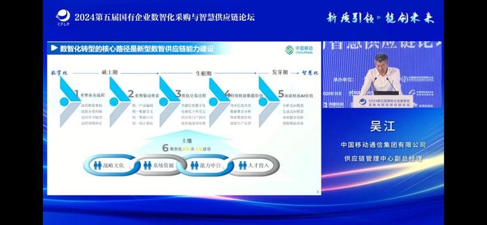 【亿邦原创】在2024年7月11日由中国物流与采购联合会主办、亿邦动力等协办的第五届国有企业数字化采购与智慧供应链论坛上,中国移动通信集团有限公司供应链管理中心副总经理吴江发表了题为《供应链数智化转型探索和实践》的演讲。