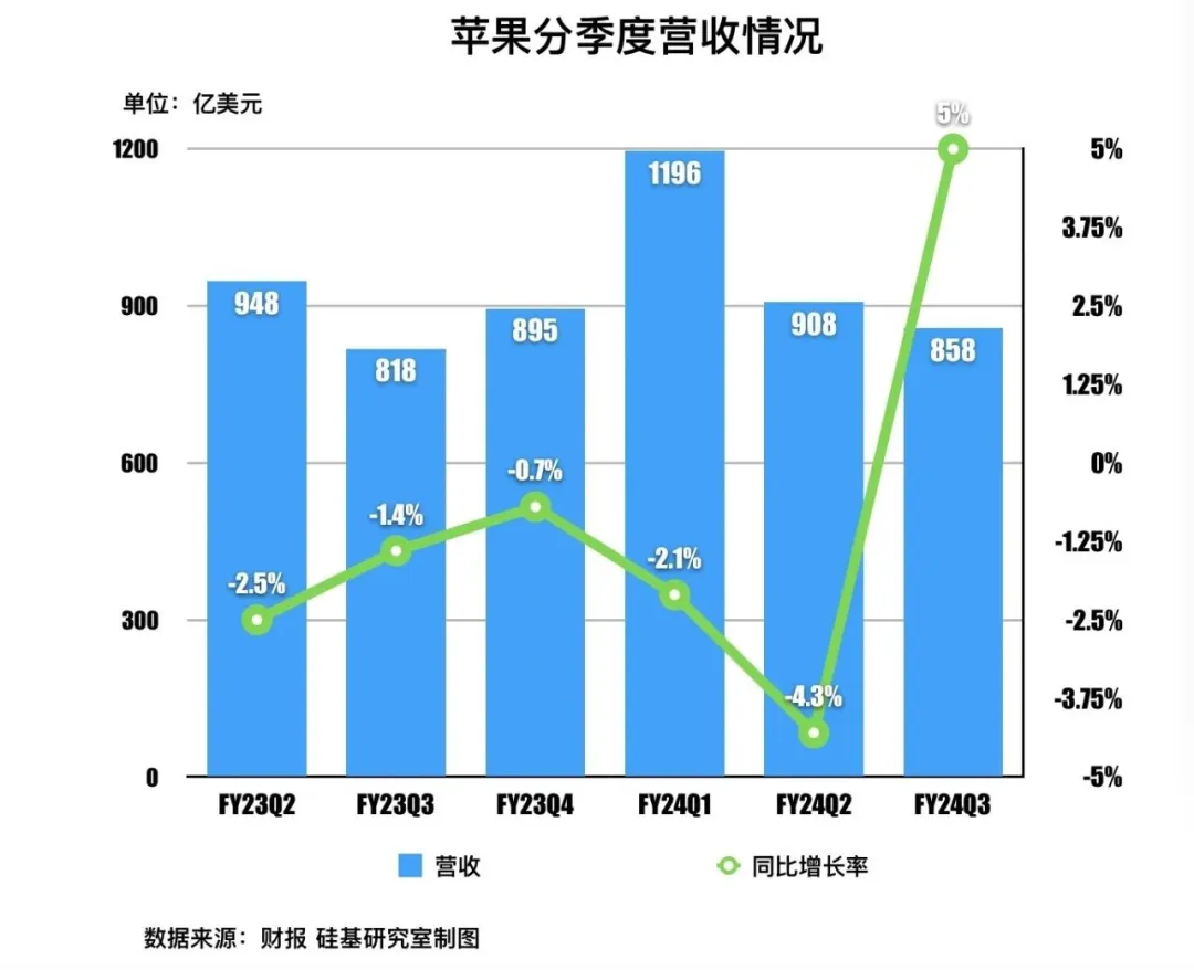 财报显示,本季度,苹果实现营收858亿美元,同比增长5%,增速快于预期,终于摆脱此前持续的销售低迷,主要受益于iPad业务的强势增长。同时,尽管 iPhone收入继续低迷,但降幅已明显收窄,同比下滑1%,达393亿美元。但中国市场的表现依旧令人失望,大中华区收入下降6.5%至147亿美元,低于分析师预期的153亿美元。