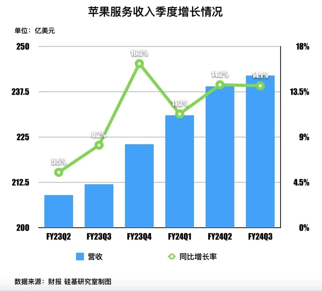 第二重驱动则是来自「新围墙花园」下的「新苹果税」。AI上线后,在苹果封闭生态下,用户、大模型厂商以及内容服务商会建立新的合作模式,因此苹果的分成收入也会有新的改变。比如,在用户端,苹果的AI功能或取代部分工具型APP。国信证券就在研报中指出,若苹果智能后续能成功,其议价能力可继续攀升情况。本季度,苹果软件服务收入也持续提高,同比增长14%至242亿美元,毛利率继续维稳在74%。