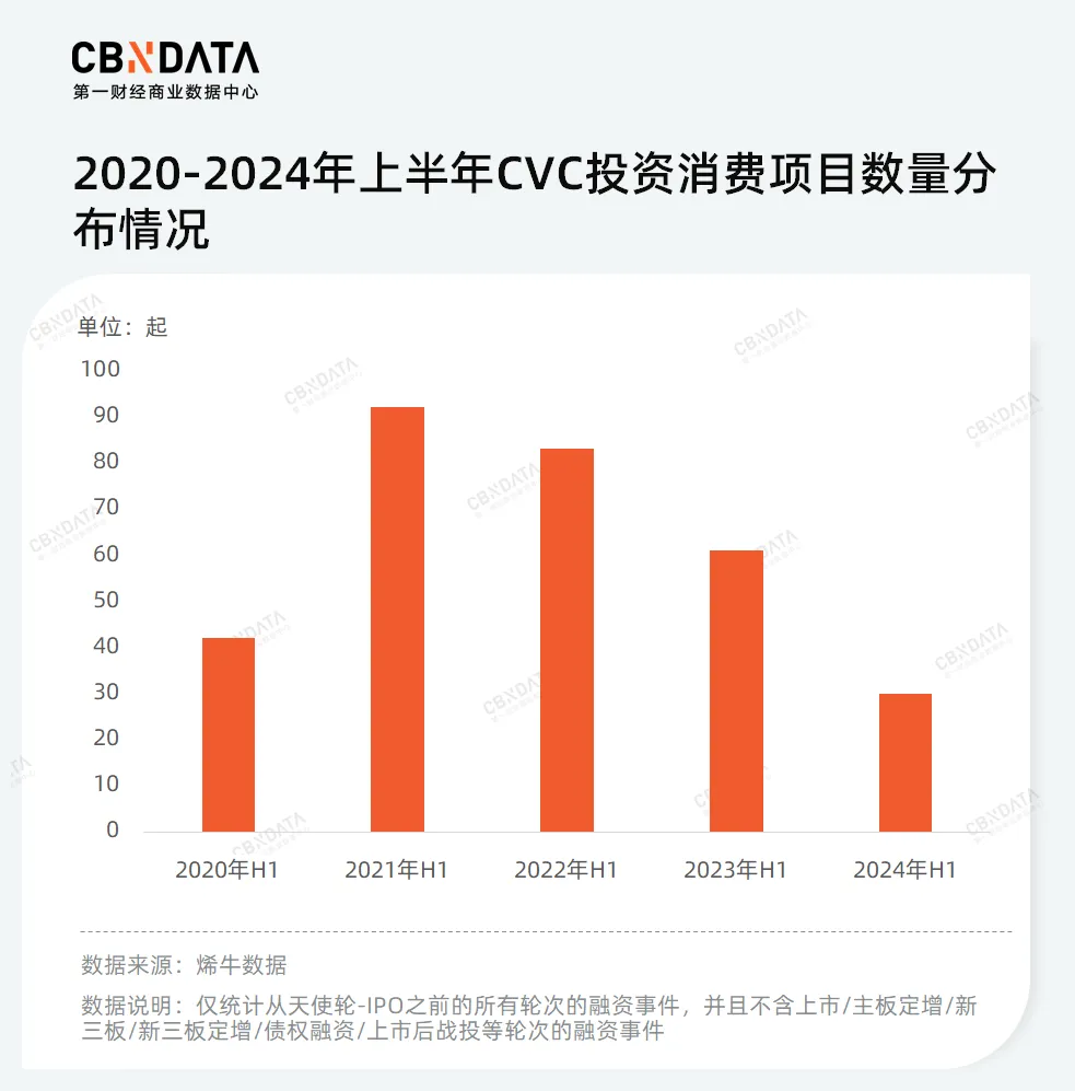 值得一提的是,曾经大爆发的CVC投资模式开始走弱。“商而优则投”, 过去越来越多品牌、平台、上下游产业端以及与消费毫不相关的CVC转身做起消费投资。而随着市场低迷,CVC的“余粮”也不多了,不止投资项目数量减少,大额投资(投资金额超1亿)更是从去年上半年的13起下降到了今年上半年的5起。