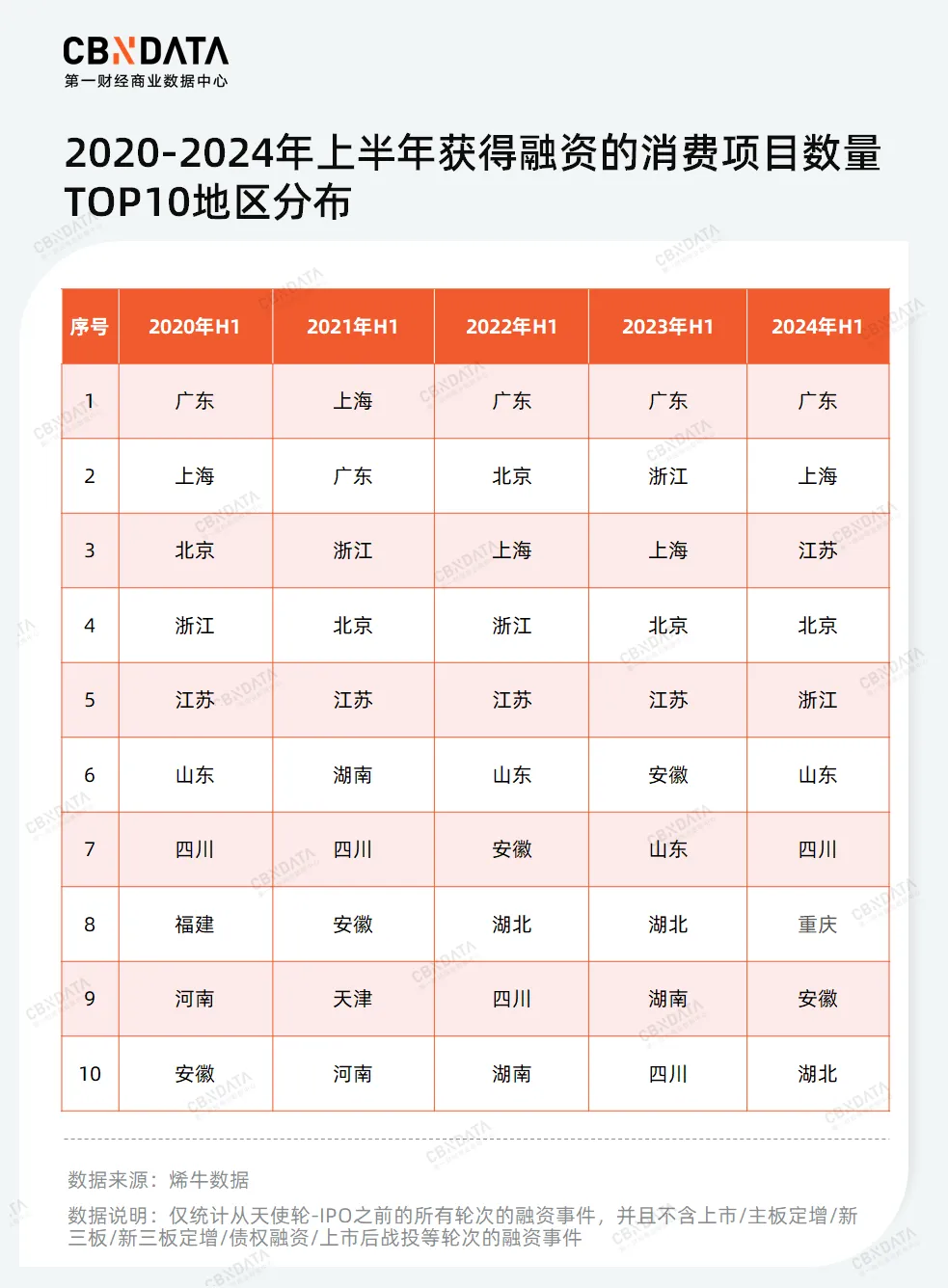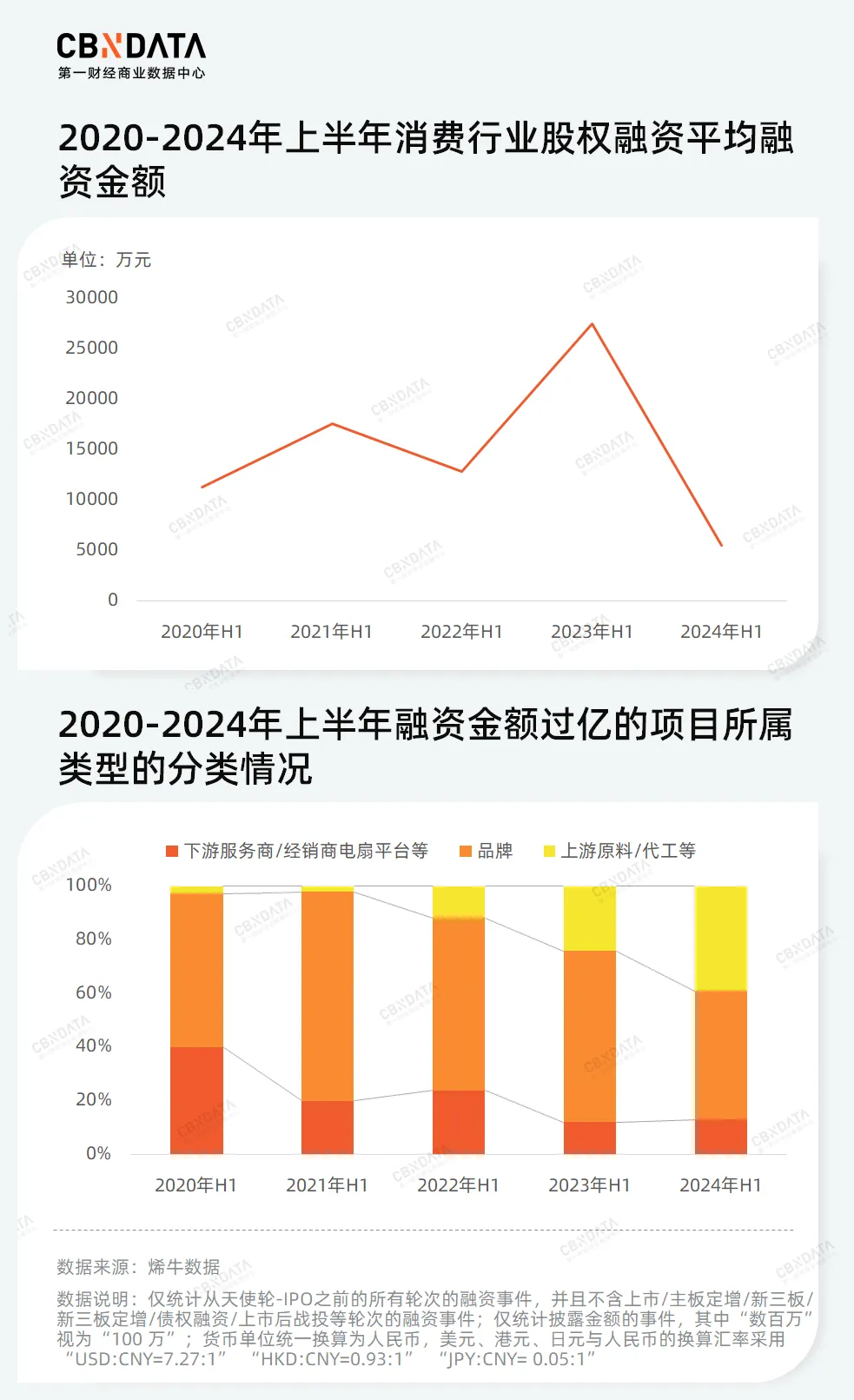自2021年上半年消费行业达到融资巅峰后,消费融资次数持续走低。同去年相比,2024年上半年的融资情况更显疲软,达到近5年每上半年融资数量的最低点。