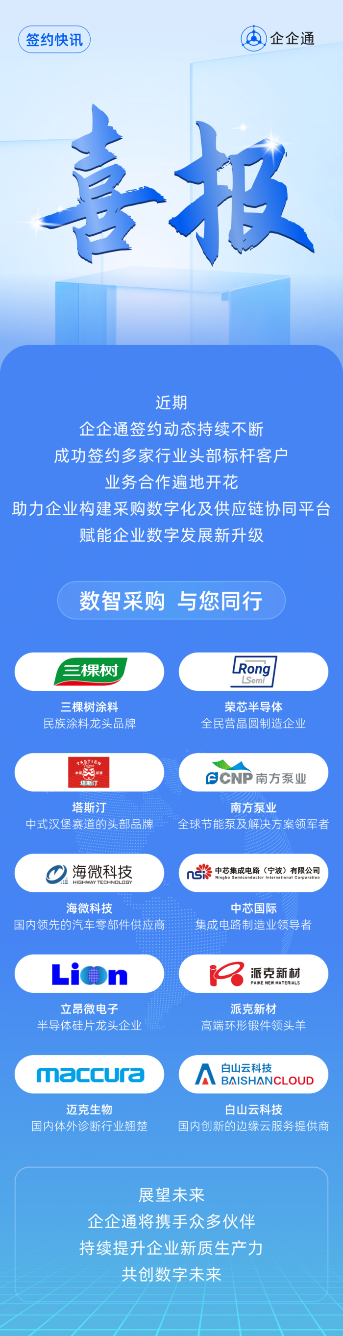 企企通近期成功签约了多家行业头部标杆客户,标志着公司在深化行业布局、拓宽服务边界上迈出了坚实的一步。此次合作不仅彰显了企企通在供应链管理、采购数字化及企业协同等领域的专业实力与创新优势,更体现了市场对企企通解决方案的高度认可与信赖。通过深度融合客户需求,企企通将助力该客户实现供应链效率的显著提升与成本的有效控制,共同推动行业数字化转型进程。此合作成果是企企通持续创新、深耕行业、服务客户的又一里程碑,预示着双方将在未来携手并进,共创更加辉煌的成就。