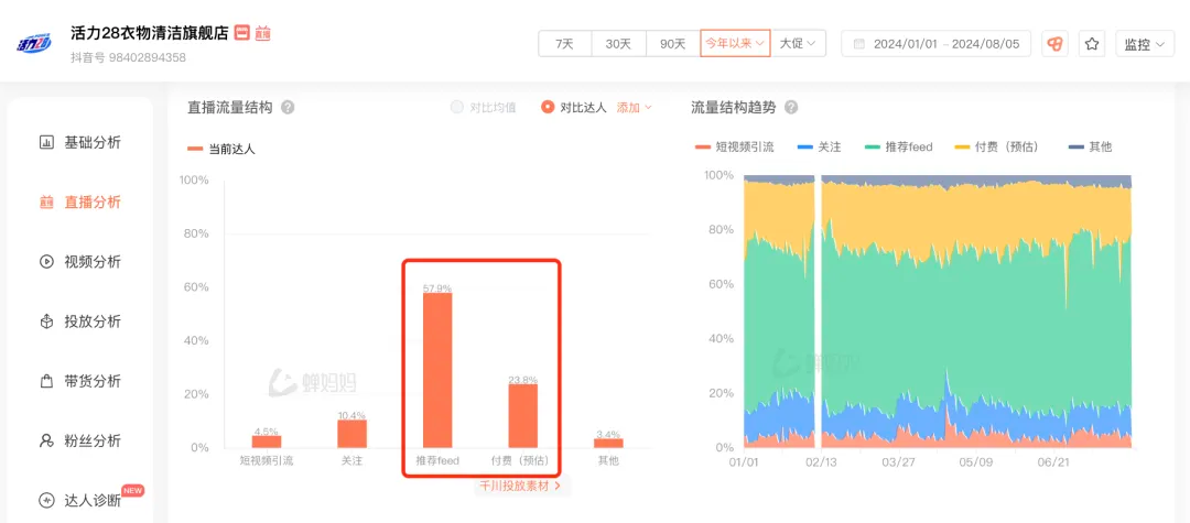 从去年爆火至今,活力28直播间的流量有什么变化呢?我们通过蝉妈妈查看@活力28衣物清洁旗舰店的直播流量结构,发现2023年下半年的付费流预估占比10.1%,2024年以来,付费流量占比上升至23.8%,说明活力28也在逐步重视付费流量的获取。