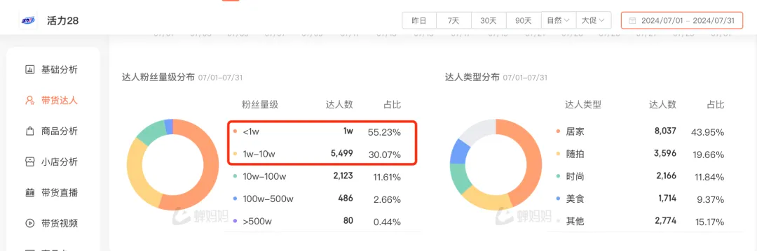 在蝉妈妈进一步查看,我们发现活力28合作的达人,粉丝量级在<1w和 1w-10w 之间的素人、尾部达人占到了85%+,以居家类型的为主。