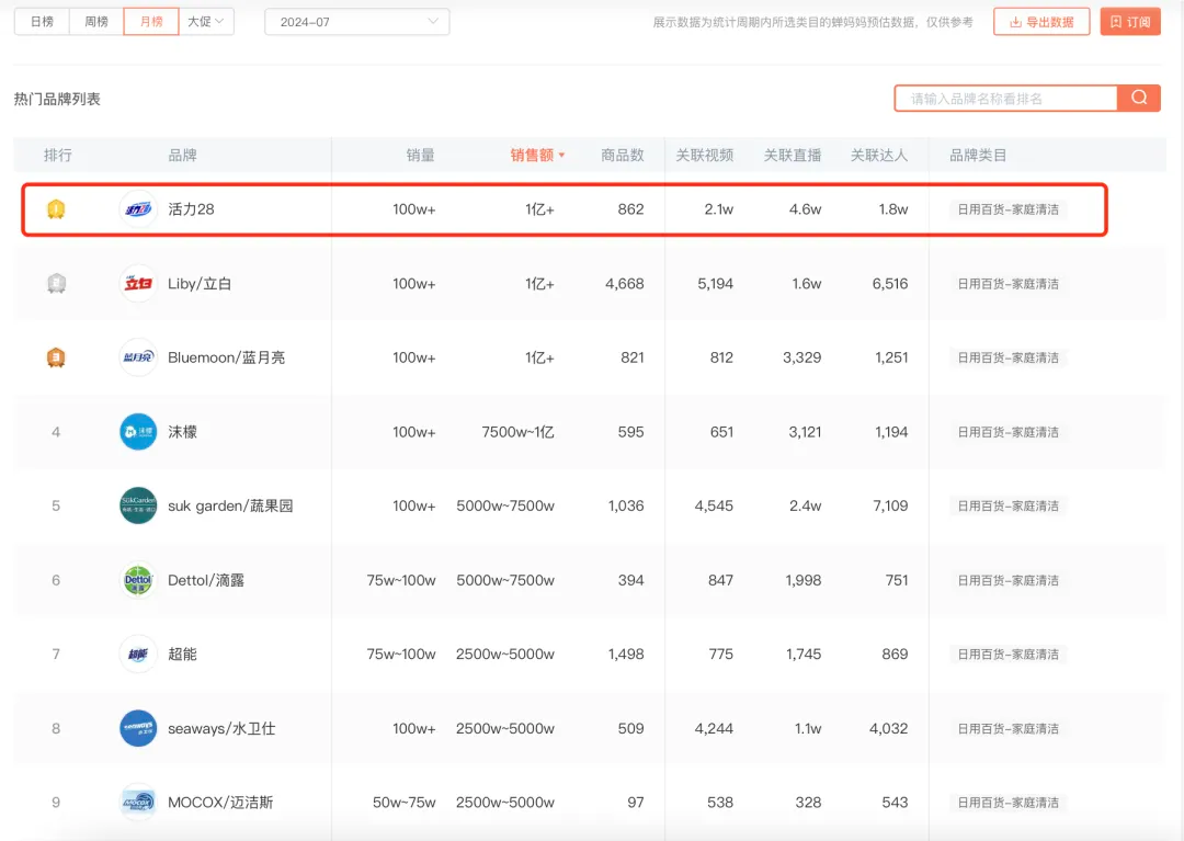 我们通过蝉妈妈热门品牌榜发现,在刚刚过去的7月,国货老品牌“活力28”,在抖音卖出100w+单,拿下1亿+GMV,直接干到了「日用百货-家庭清洁」类目品牌7月榜的TOP1。