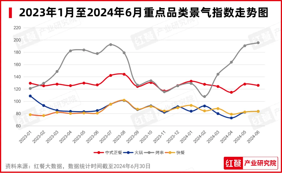 从数据上看,中式正餐依旧处于景气状态,但6月餐饮景气指数有所下调,其发展呈现出一定程度的降速;火锅在市场环境不佳的情况下仍逆势增长,6月火锅的景气指数为85.0,较前几个月有所回升。烤串品类受季节性因素影响,6月的餐饮景气指数为178.0,可见夏季其市场需求旺盛,呈高度景气;快餐品类总体上呈现出企稳迹象,6月的餐饮景气指数为80.9,与前几个月相比略有提升。