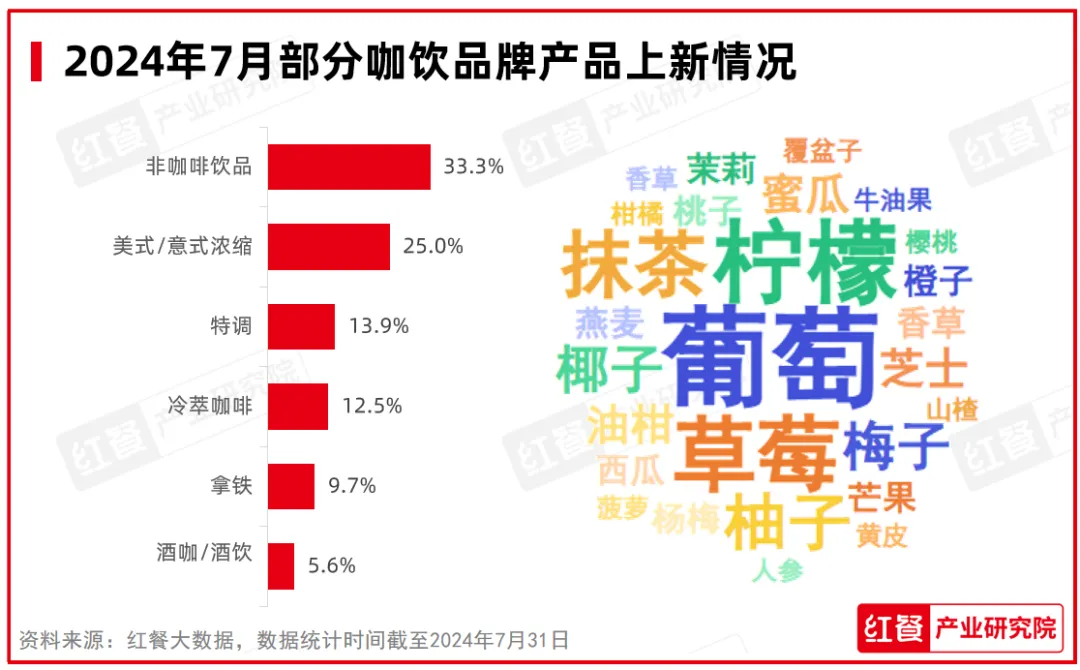 其中,非咖啡饮品类新品数量依旧领跑,7月共推出了24款,占咖饮新品总量的33.3%。其次是美式/意式浓缩类,7月共推出了18款新品,占新品总量的25.0%。特调类新品相对上月数量有所增加,占比达13.9%。酒咖/酒饮新品虽相较上月有所增加,但占比仍然较低,仅为5.6%。
