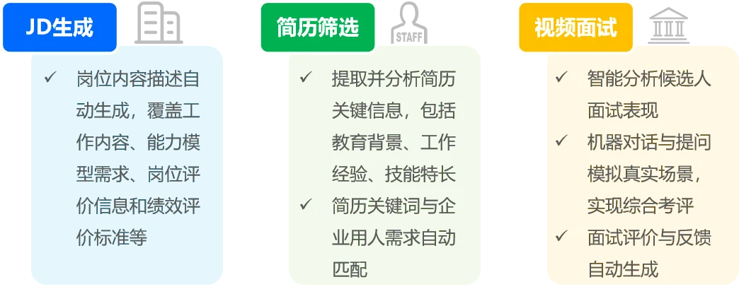 JD生成、简历筛选及面试等环节的自动化与智能化,大幅缩短招聘周期,将人力资源部门从繁琐而重复的工作中释放出来的同时,为企业提供实时招聘数据分析,由此助力企业及时调整招聘策略、优化招聘效果。而从候选人角度来看,AI招聘模式为其提供便捷的信息查询和面试预约入口,以更为人性化的交互提升招聘体验。