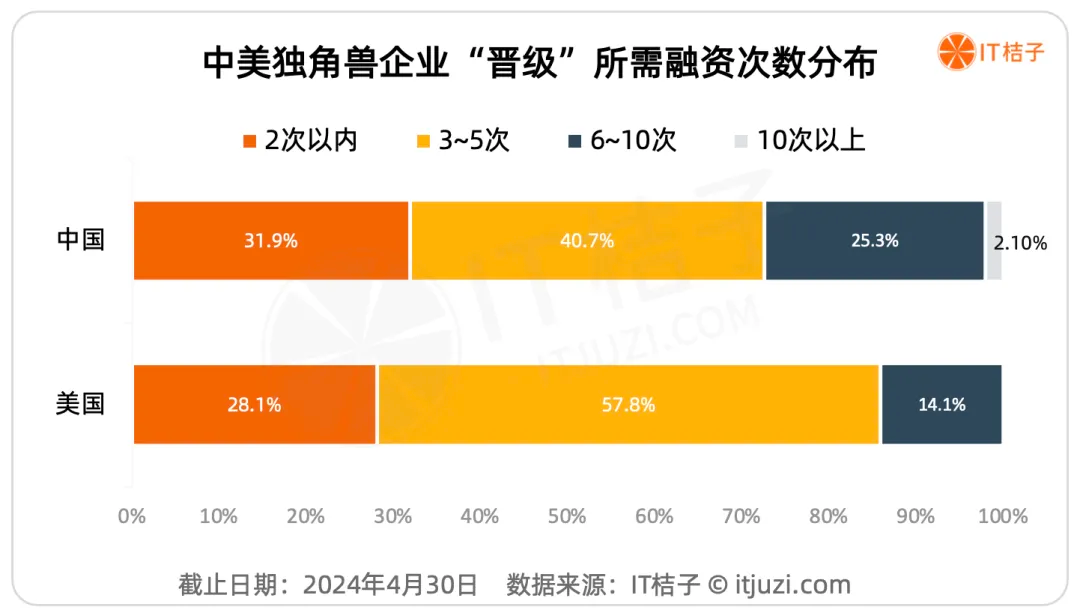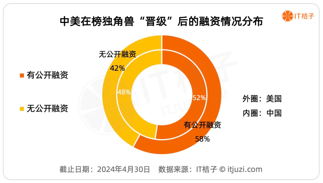 根据IT桔子数据,中国独角兽中有48%的企业在达到10亿美元估值后再也过没有公开的融资,有新融资的占比为52%;美国的独角兽后续融资则略高,有公布融资的占比为58%。