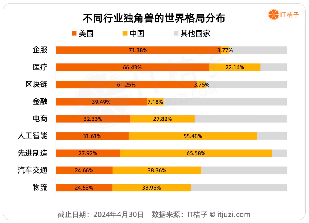 再横向对比,从世界经济格局和独角兽行业数量分布可以看到一些明显的差异和特色。