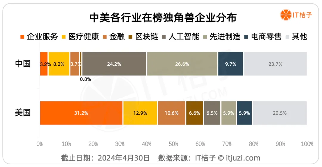 IT桔子数据显示,中国在榜独角兽最多的是先进制造业,占比26.6%;第二多的是人工智能行业,占比24.2%;第三多的是电商零售业,占比9.7%;再之后是医疗和金融。