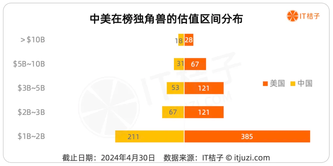 在榜独角兽估值分布:美国总量多,平均值低于中国