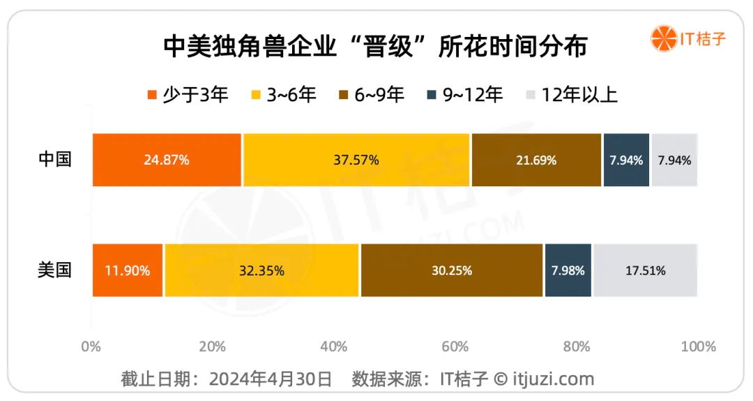 根据IT桔子数据,从成立到成为独角兽,大部分企业需要花3~9年的时间,美国有59.3%的独角兽属于这个区间,中国有62.6%。在这其中,费时3~6年更加常见。