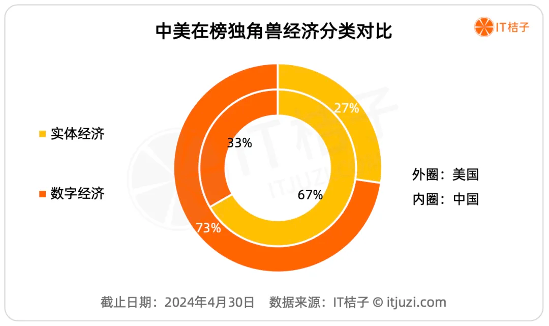 从上图看出,美国在榜独角兽结构是七成的数字经济形态,三成的实体经济形态。中国则恰恰相反,实体经济相关的企业占据了2/3的江山,仅1/3是数字经济业态。