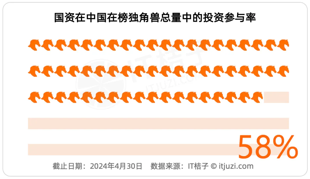 IT 桔子数据显示,被国资背景机构投资过的中国独角兽数目前已经达到了 219 家,在所有的在榜独角兽中体量占到了 58%,超过了半壁江山。