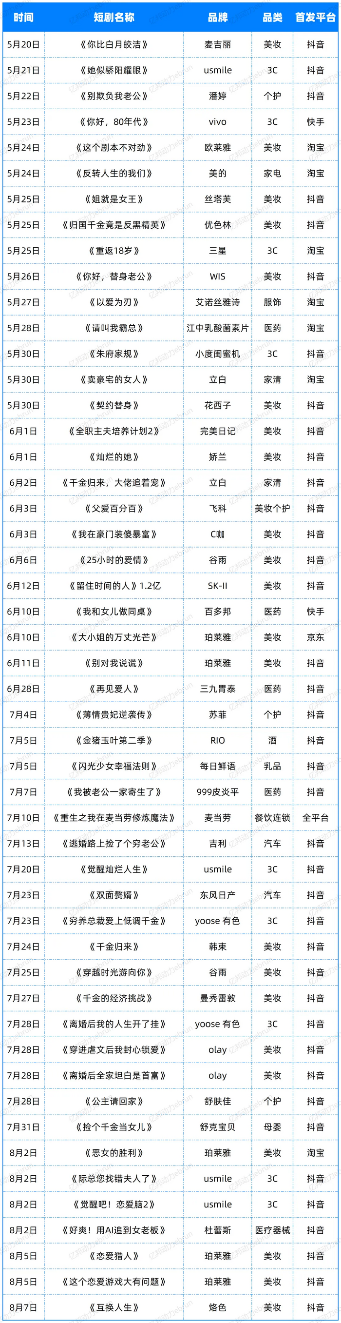 一位短剧行业从业者向亿邦动力表示,今年上半年,品牌合作剧数量全行业同比增长68%。为进一步探究当下品牌投入短剧的具体情况,如品类特点、投放平台和数据表现等,亿邦动力统计了抖音、快手和淘宝等平台上,今年618以来的品牌定制剧。