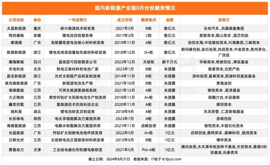 2024 年 8 月,新能源产业链共发生了 17 起投融资事件,具体事件分布如上表所示。
