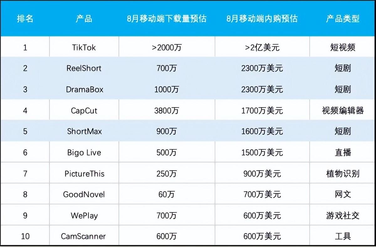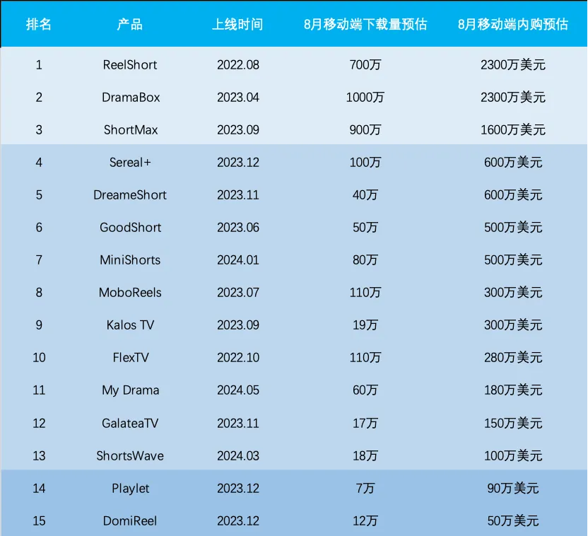 8月主要出海短剧应用收入、下载情况|