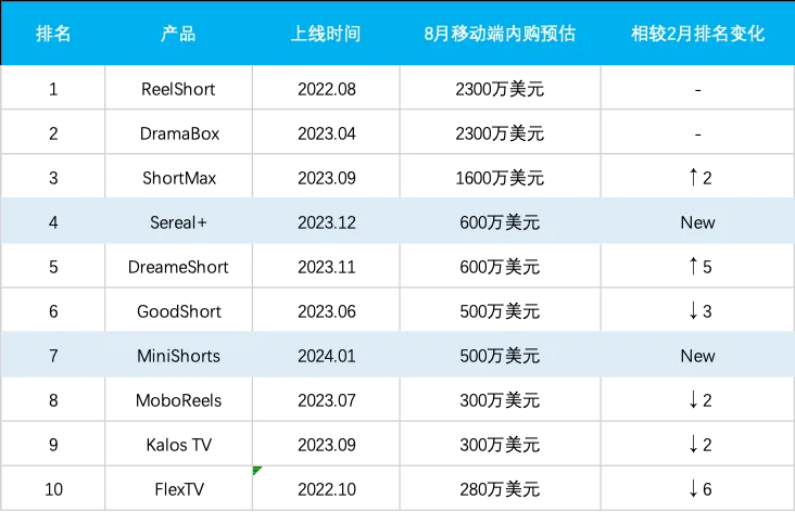 8月出海短剧收入Top10|数据来源:Sensor Tower