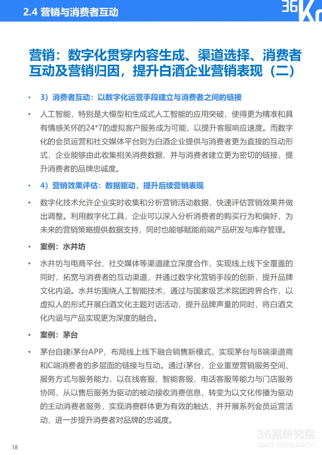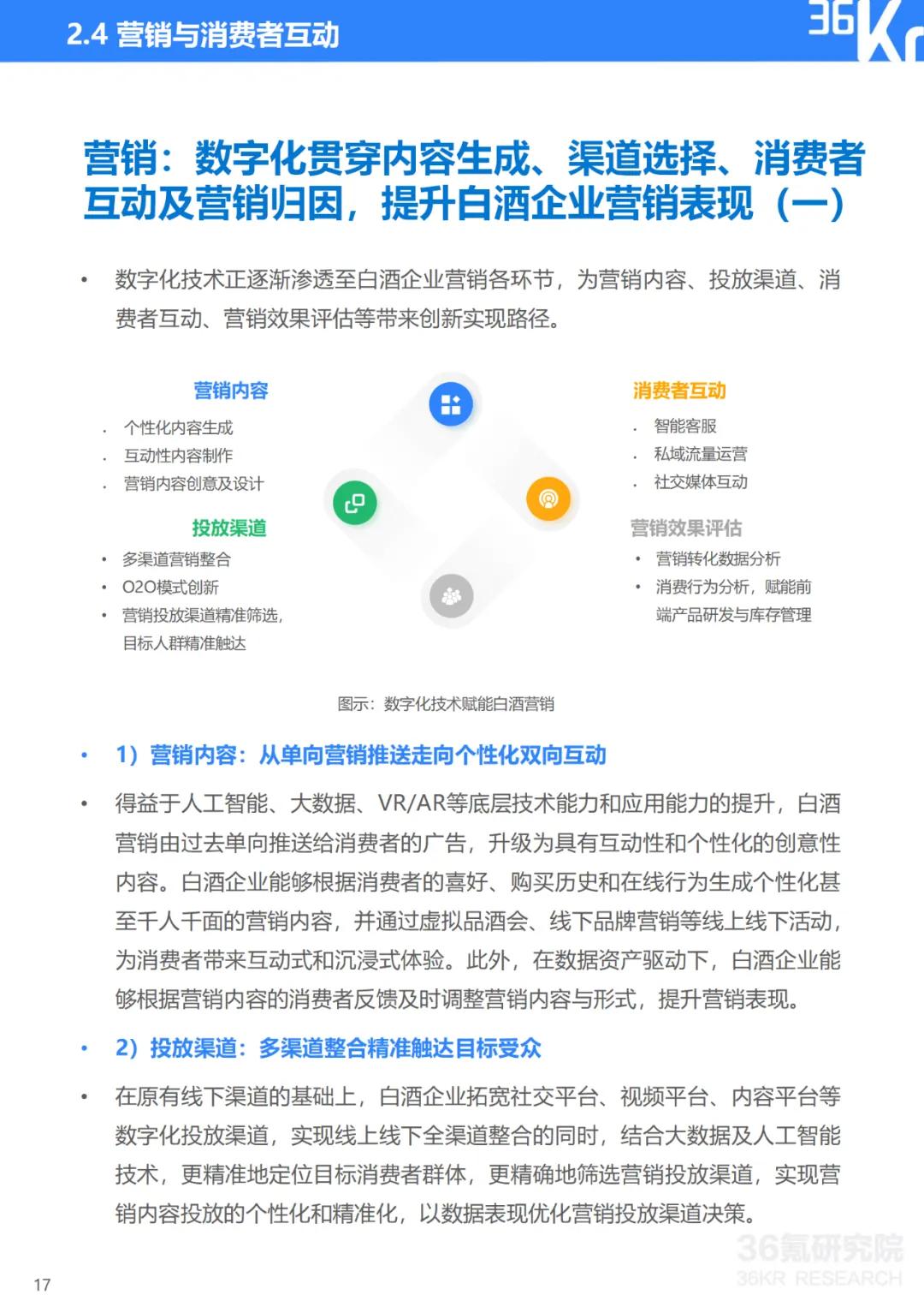 3)营销与消费者互动。随着人工智能、大数据、VR/AR等底层技术能力和应用能力的提升,白酒营销由过去单向推送给消费者的广告,升级为具有互动性和个性化的创意性内容。而人工智能,特别是大模型和生成式人工智能的应用突破,使得更为精准和具有情感关怀的24*7的虚拟客户服务成为可能,提升客服响应速度的同时,拓宽消费者互动入口,在品牌与消费者之间建立更为紧密的链接。此外,营销数据的量化归因还为后续营销策略的优化提供坚实的数据基础,助力企业实现营销内容的精准投放,提升营销表现。
