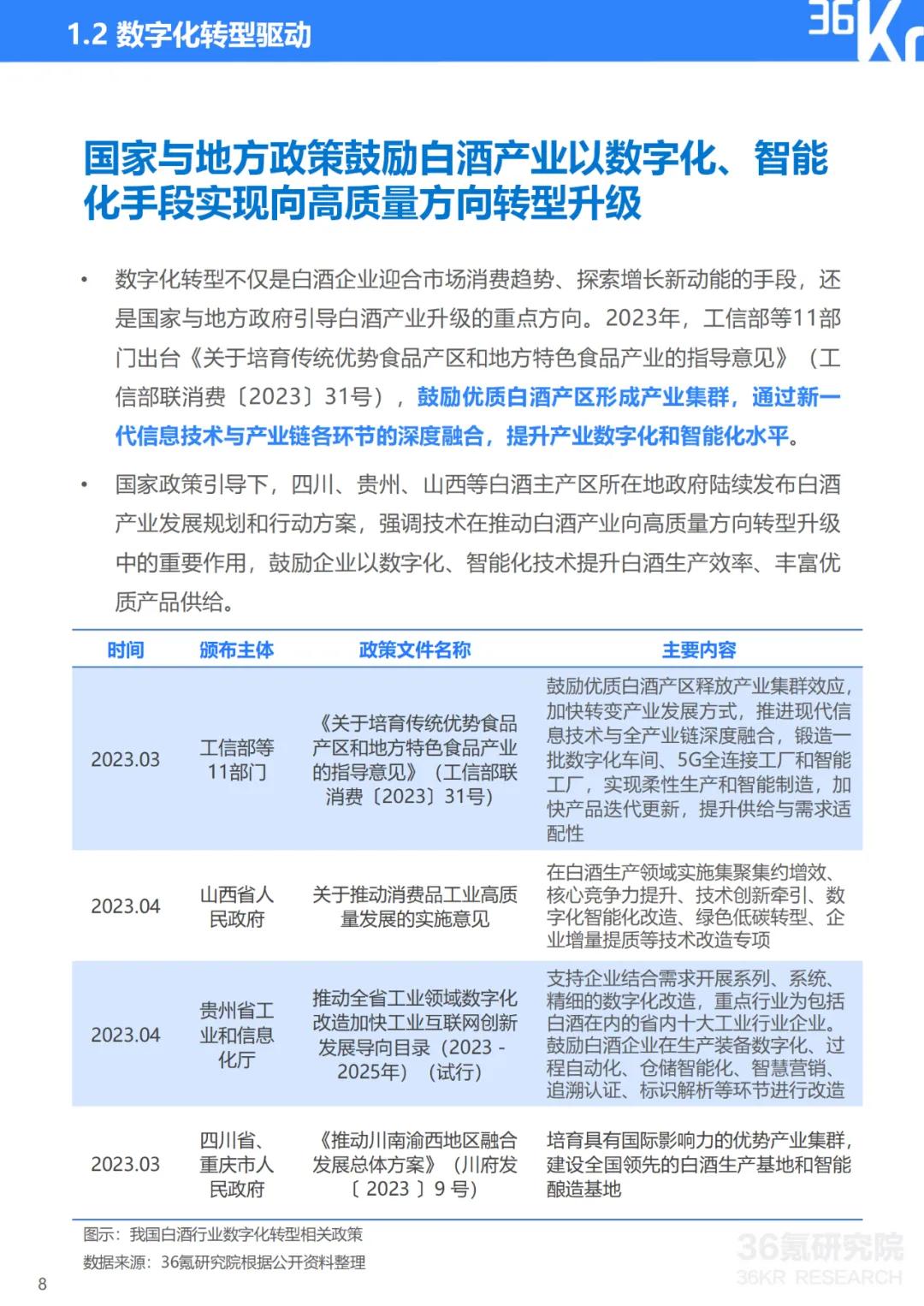 白酒行业的数字化转型,一方面顺应数字经济蓬勃发展的趋势,另一方面也是存量竞争时代企业自我革新、提升外部竞争力的实践与探索。面对消费群体、消费需求、消费场景及消费渠道的新形势与新变化,白酒企业主动拥抱数字化转型,以数据驱动,响应市场新变化和新趋势。这也与国家及地方政策相契合:政策倡导数字化、智能化技术在白酒产业高质量转型升级中发挥重要作用。