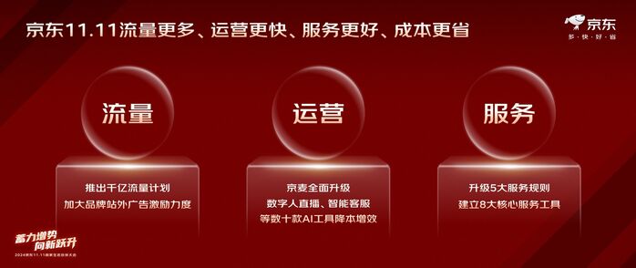 京东集团CEO许冉在会上表示,京东将从商家最关心的流量、运营和服务等核心维度出发,努力为商家提供“流量更多、运营更快、服务更好、成本更省”的新体验。例如,京东会推出各类AI工具一键为商家降本增效、提供千亿流量扶持、提供亿级广告金补贴等举措。