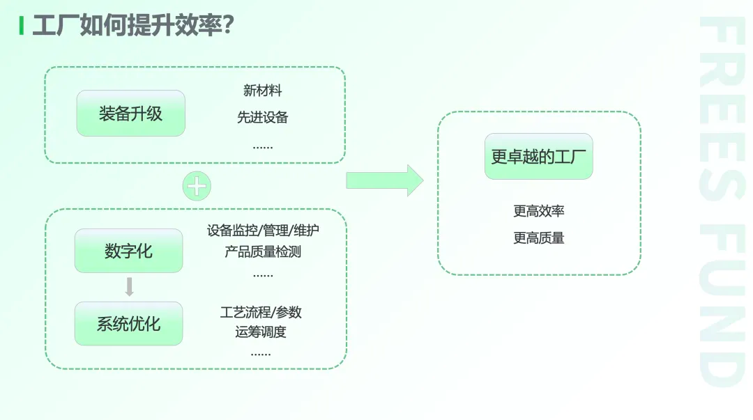 一个工厂要提升运行效率与生产质量,一方面可以选择采用更先进的装备,比如高端设备、新材料等,另一方面则可以努力提升整体运营的数字化水平,通过各类传感器来监控设备和产品的情况,进而通过智能化手段来优化系统效率,比如改进工艺流程或参数、优化运筹调度等。