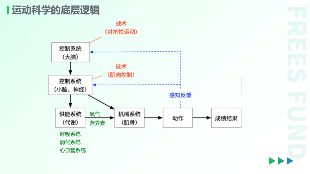 当我们开始做运动时,无论是跑步还是打球,大脑会先决定我们的行动目标,然后通过小脑指导我们的身体来实现这些目标。最后在执行层面,我们会调动底层的代谢系统、神经系统和肌骨系统来完成相应的动作。
