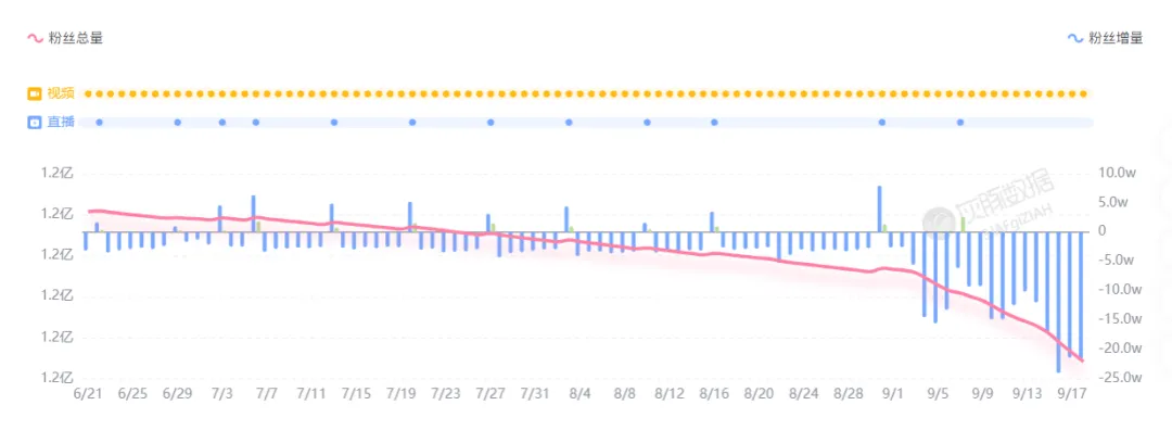 20天掉粉300万人,并且其还在以每天掉粉20~30万的速度流失。