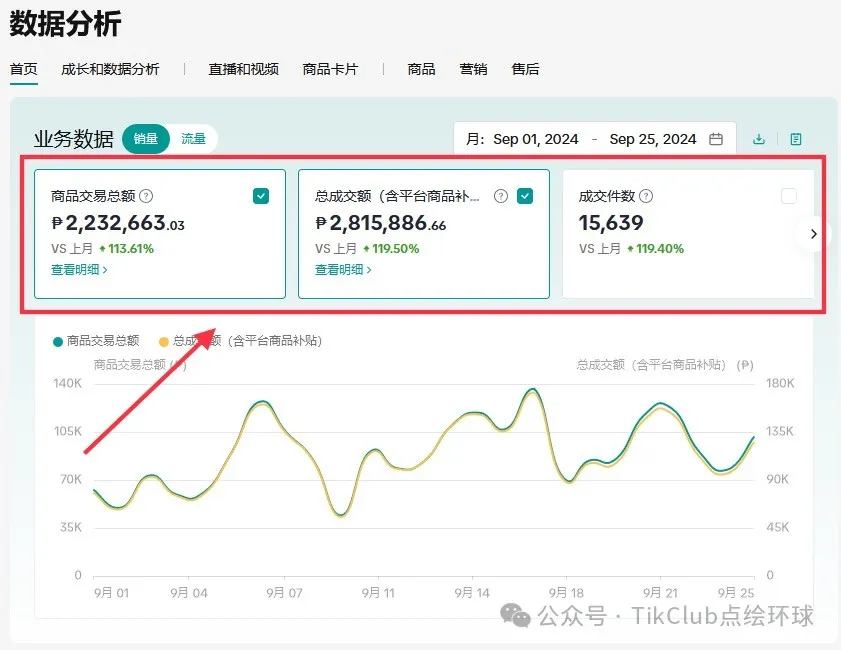 事实证明,付总的选择是正确的。截止2024-09-25,小店单月成交了15639件商品,商品交易总额高达223万比索,纯自然流的情况下就有57万的商品访客数。