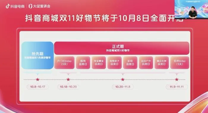 9月19日,快手率先召开双11商家大会,宣布其双11活动将分为筹备期、预热期、开门红、品类日、狂欢日五个阶段,细致规划了从前期准备到最终高潮的每一步。