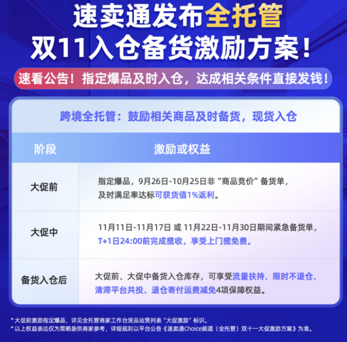 此外,近期积极响应备货,还有机会获得海报中备货双11平台“直接发钱”的货值返利激励。