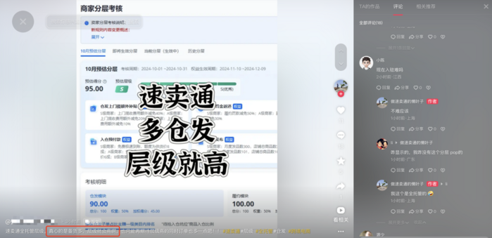 确定“双轨驱动”后,全托管和POP分层权益也随后生效,近日网上有全托管商家晒出了自己的10月层级,S级的商家标签引来其他商家的羡慕,该商家在网上分享了“冲级”经验:“规则很简单,其实就是多仓发、层级就高。”