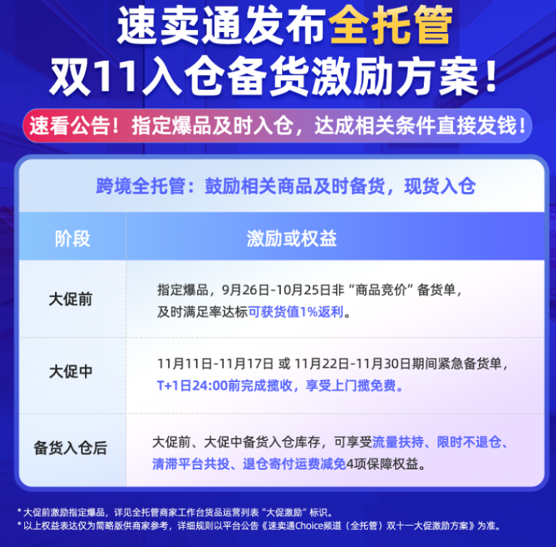 此外,近期积极响应备货,还有机会获得海报中备货双11平台“直接发钱”的货值返利激励。