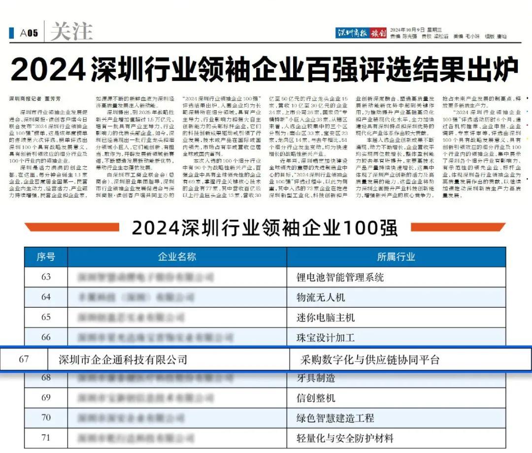 近日, 企企通荣誉上榜“2024深圳行业领袖企业100强”,成为采购数字化领域唯一一家上榜企业!
