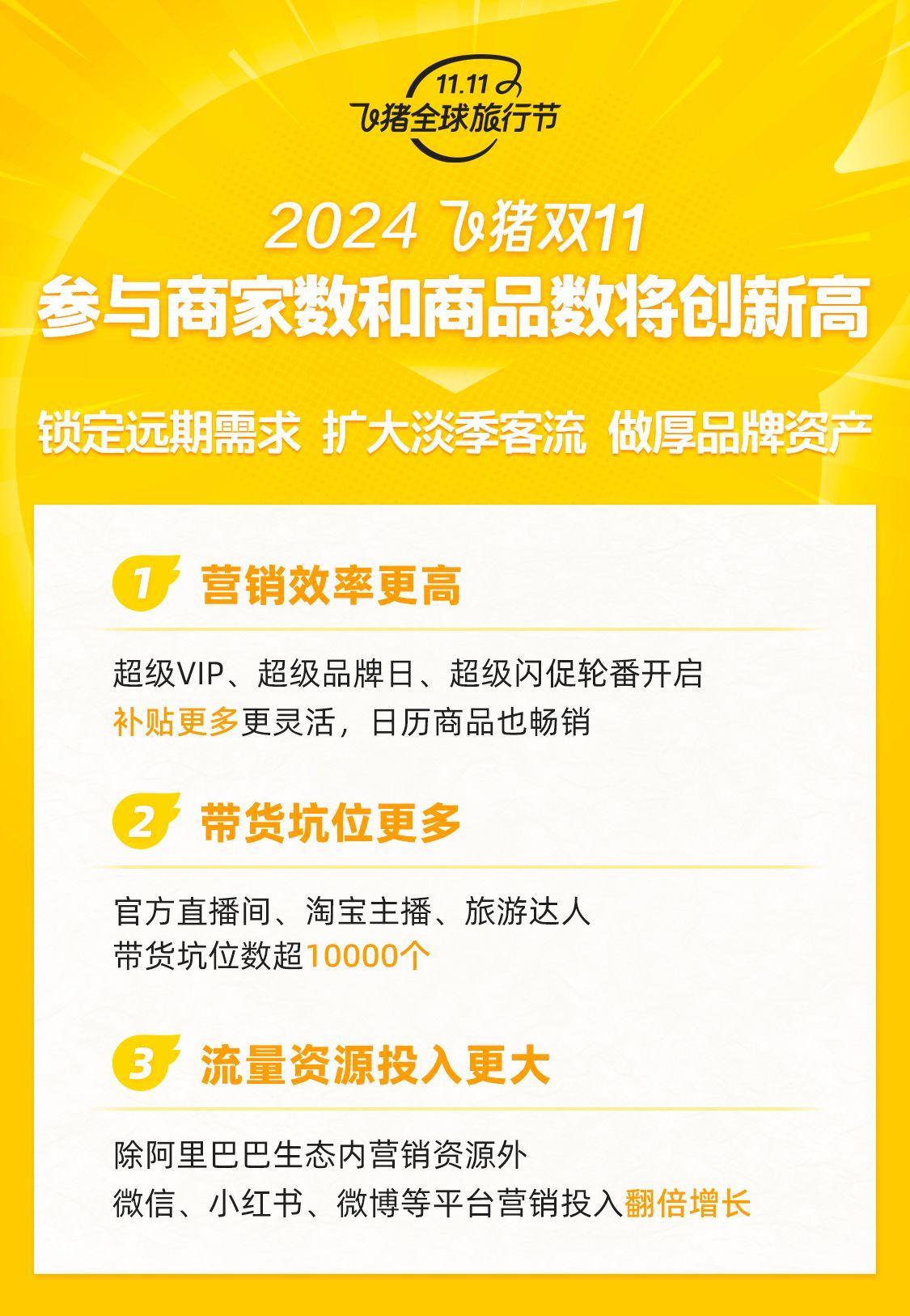 据帅梦婷介绍,除了阿里巴巴生态内更大力度的流量获取措施外,双11期间飞猪在微信、小红书、微博等平台的流量及营销投入同比翻倍增长。同时,飞猪整合了官方直播间、淘宝主播和专业旅游达人资源,今年提供的带货坑位数达上万个,创下历届双11之最。此外,飞猪将加大日历型商品的补贴力度。