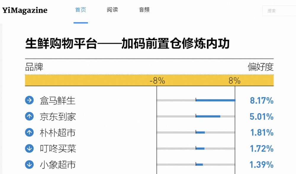 “金字招牌”是《第一财经》杂志发起的,由消费者投票选出的品牌偏好调查报告。自2009年至今,已连续举办16年,是国内最具公信力的消费市场民意调研之一。报告显示,生鲜购物平台分类中,盒马鲜生位列第一,TOP5的其他品牌分别为京东到家、朴朴超市、叮咚买菜、小象超市。一财杂志评价道“盒马在它的优势领域生鲜电商,目前看来还暂无敌手。”