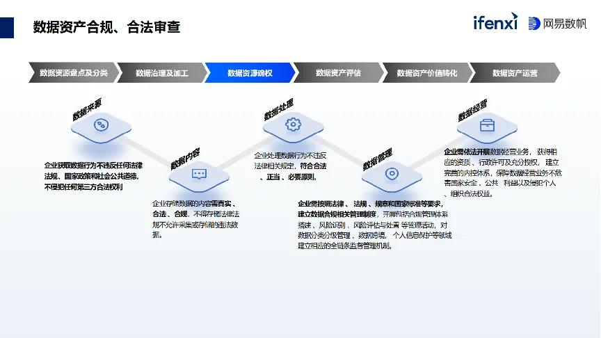 数据资产加工治理好后,接下来要对外确权,首先提到数据的持有权,数据资源跟其他资产不一样,强调谁持有谁获益,比如采集的数据,实际上并不是我所拥有,如通过渠道获取到的用户数据或车辆数据,但这部分数据不属自己,但通过合规的加工后可获取收益,相当于在对数据有持有权的过程中获取相关收益。第二个强调的是数据的加工和使用权,这部分一定要遵照合规合法的要求。第三产品经营权,加工后的数据产品要投入运营,可以在企业内部,也可以委托三方、交易所进行运营。整个数据流通过程中,不再强调所有权,而强调持有权、加工使用权和经营权,整个链路的权限不一样。