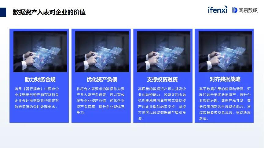 1、助力财务合规。暂行规定要求,企业按照无形资产和存货相关的会计准则及暂行规定对数据资源进行会计处理,没有说自愿,当前也没有强求,但未来对于企业来讲,数据资产入表从财务角度上看,是一定是要进行的。只有几种特殊情况可不进行资产入表,第一,企业的这个数据价值是难以评估的。第二,财务承认数据资产无贡献价值。第三,数据确实无法入表。除以上情况,均需入表。