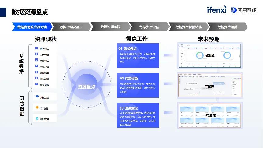 很多企业都在做数据资产盘点,但实际上数据资产我们到底怎么去盘点?首先要讲清楚整体现状,对于当前数据资源的基本信息、标准情况。针对现状问题进行诊断,基于诊断给出一系列改进的数据治理的相关意见,我们希望未来通过数据资产盘点、资源盘点形成可规范、可管理、可应用的数据资产。可规范指业务、技术口径能做到规范性的管理,可管理指数据从采集到开发过程链路是可管理的,通过元数据统一管理。最终数据是可被应用,通过 API 、数据集等方式对外提供相关应用。