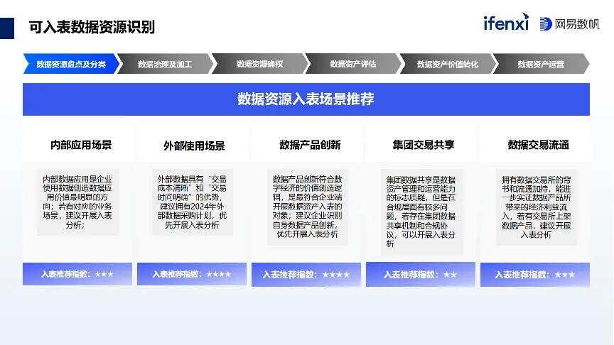 12 类行业,5 个具体场景。基本可以把企业内部一级、二级可入表的数据梳理起来,再具体向下展开,看资产入表的场景具体属于哪一类目,进行拆解。