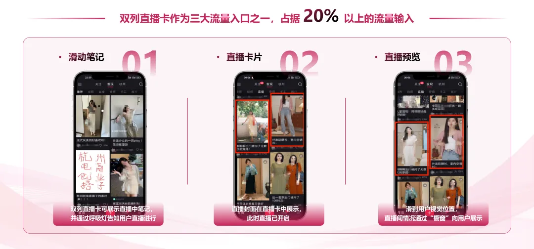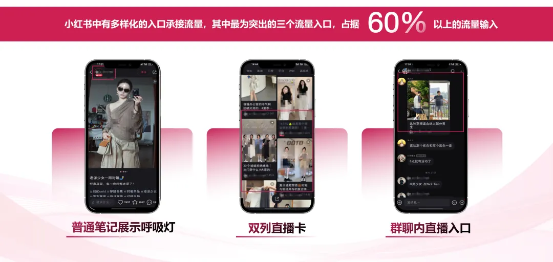 小红书中有多样化的直播入口承接流量,其中有3个主要的流量入口,占据60%+流量输入,分别是:推荐页、关注页、群聊。