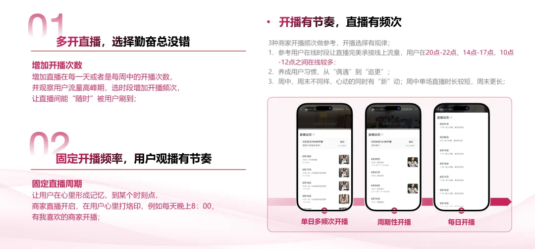 3.勤开播;在成本可控的情况下尽量多去开播,提高时长,提高频次,建议做到日播,每场直播不低于6h。