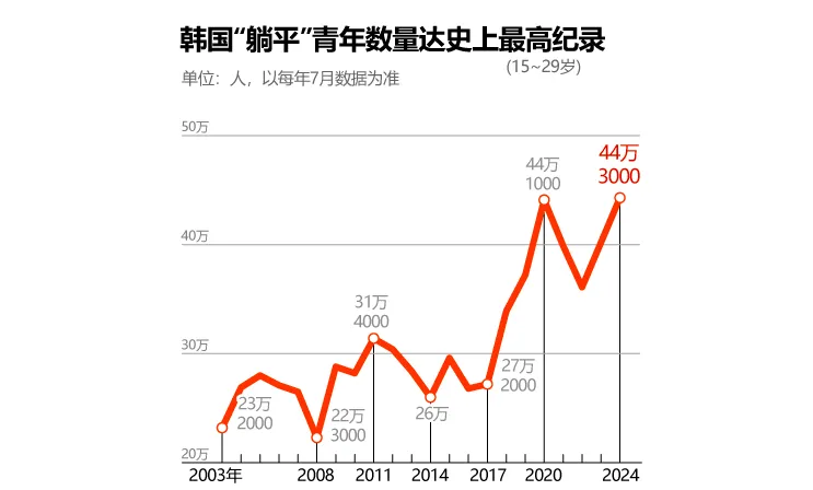 另一方面,比种植面积减少更让韩国担忧的是,韩国正面临农业劳动力严重不足的问题。韩国汉阳大学经济学部教授河俊京表示,大流行结束后,韩国虽短暂出现劳动力短缺情况,但由于国内整体需求减少,企业生产下降,就业诱导效应较低。因此,看不到未来的韩国年轻人,愈发喜欢“躺平”。2024年韩国15-29岁“躺平”的青年群体高达44.3万,创下韩国20年之最。