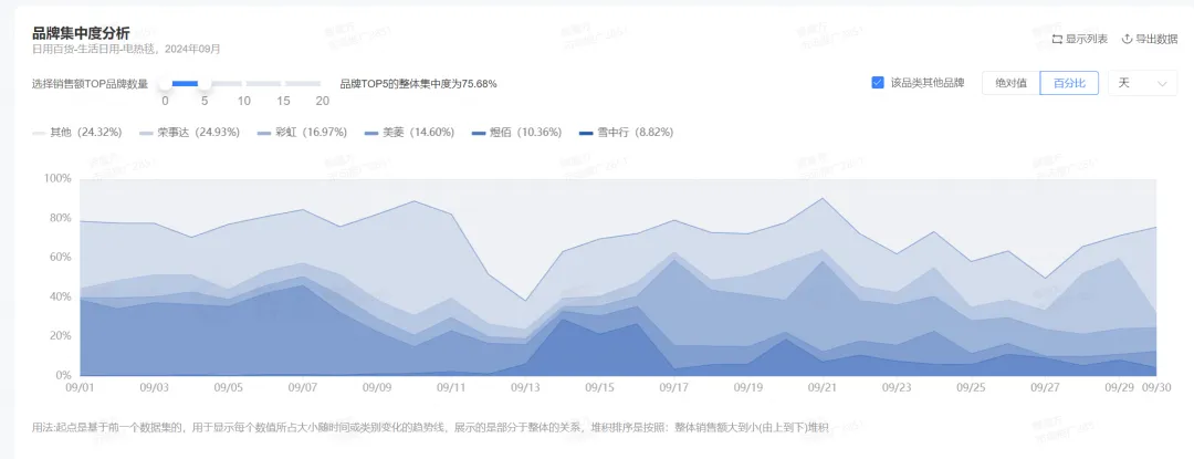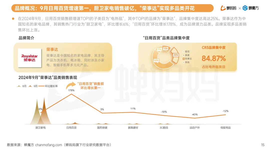 但24年,荣事达抢先开跑。在2024年9月,日用百货销售额增速TOP1的子类目为“电热毯”,其中TOP1的品牌为“荣事达”品牌集中度达高达25%。