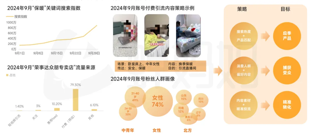 “荣事达”紧抓这一黄金节点,用“电热毯”这一应季产品作为账号主推产品。根据受众人群画像制作视频的核心在于深入了解目标观众的需求和偏好,从而创作出更具吸引力和相关性的内容,并加大付费投流占比,抓住精准人群快速实现转化。