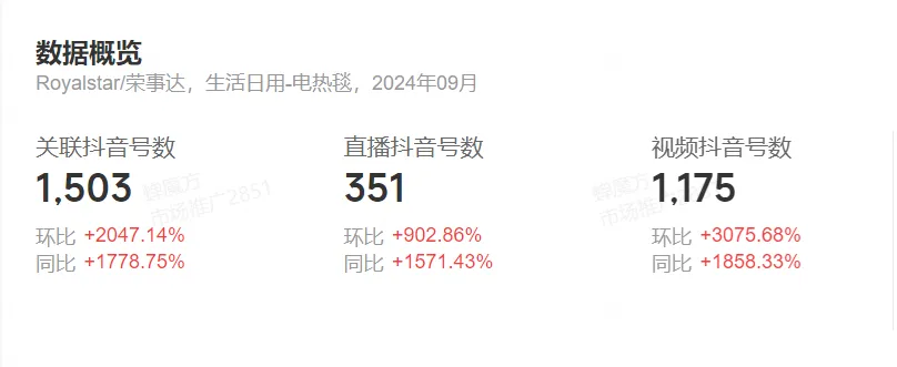 9月份,荣事达也快速扩张抖音合作号,该品牌的关联抖音号、直播抖音号、视频抖音号同比均有超过1500%的增长。