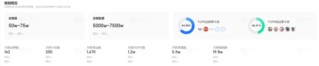 秋冬换季时节的到来,抖音电商电热毯品类销售额也在持续提升,近30天销售额已经超过5000万元。伴随着双11大促的到来,电热毯品类也将迎来今年的爆发期。