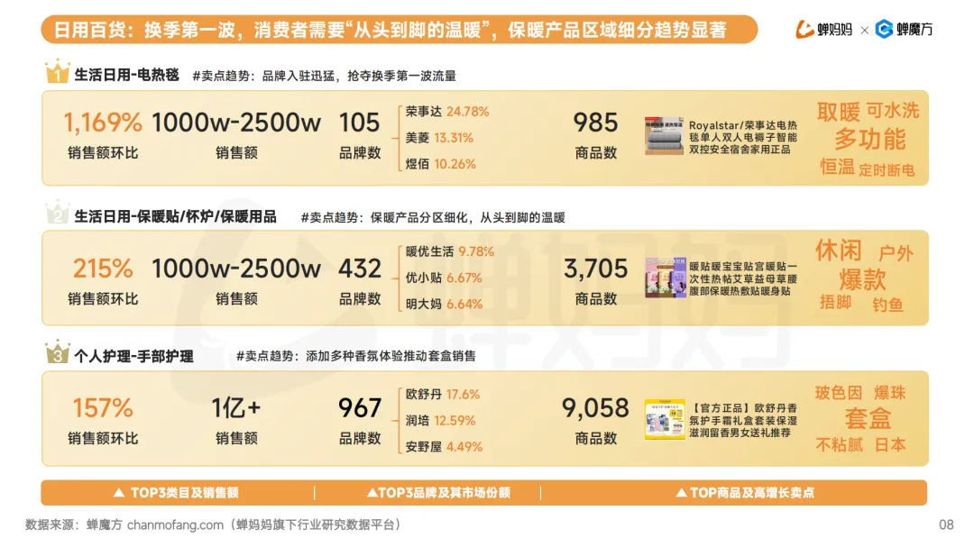 与此同时,应季电器开始热销,蝉魔方发现近期“电热毯”在抖音平台的销售额暴增。根据蝉魔方发布《抖音电商9月品类增长月报》显示,“电热毯”品类抢夺换季第一波流量,9月抖音平台电热毯品类的销售额环比增长1,169%。